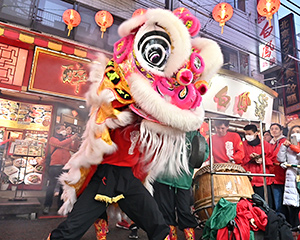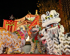 伝統の獅子舞「採青(つぁいちん)」がけたたましい爆竹や太鼓の音が鳴り響く中で行われ、一帯は華やかにまさしく「春節」独特の雰囲気に包まれます。白や黄色などに彩色された5頭の獅子が5コースに分かれ、各店舗の商売繁盛や五穀豊穣を祈って獅子舞を披露します。獅子は銅鑼や太鼓に合わせて激しく踊り、最後に後ろ足で立って伸び上がり、店先につるされた祝儀袋の「紅包(ほんぱお)」をくわえ取ると爆竹が鳴り響きます。