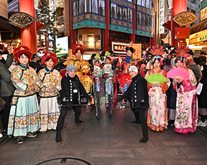 2月21日(土)には「春節」の一大イベントである祝賀パレード「祝舞遊行(しゅくまいゆうこう)」を実施致します。「祝舞遊行」では華やかな皇帝衣装隊に加え人気者の獅子も登場、優雅に舞う中国舞踊や古箏の演奏なども行われます。勇壮な中にも愛らしい表情の獅子舞や、中国舞踊、古箏の演奏は来街者のすぐ目の前で行われ、それは中華街の「春節」でなくては体験できない光景です。華やかな衣装や、目前で繰り広げられる様々な演技、横浜中華街の「祝舞遊行」を存分にお楽しみ下さい。