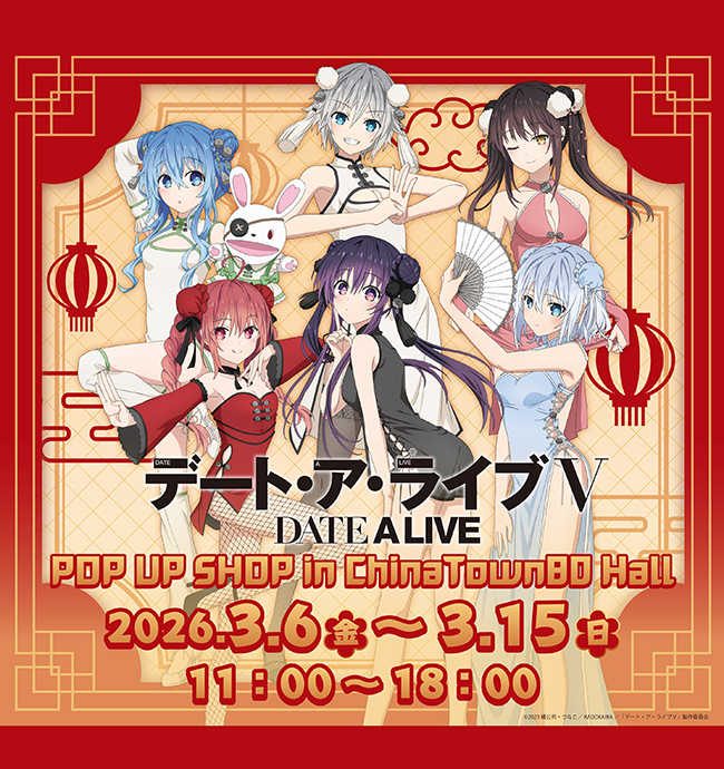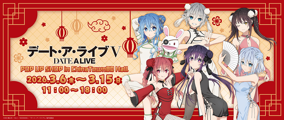 2026年3月6日(金)~3月15日(日)にて、『デート・ア・ライブV』コラボキャンペーン開催いたします。中華街でお買い物をしていただきますと、特典コースターがゲットできます。また、ChinaTown80Hall には「POP UP SHOP」が登場します。チャイナ服に身を包んだ、十香、折紙、狂三、四糸乃、琴里、二亜の描き下ろしイラストを使用した新商品が多数登場します!