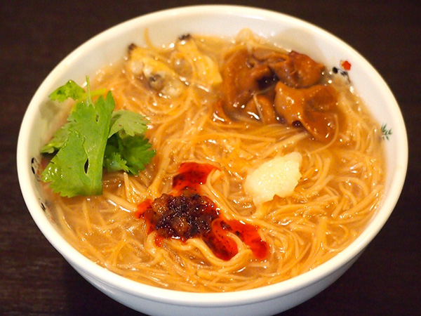 台湾夜市を代表する人気料理。日本の素麺に似た台湾独自の紅麺線を使用し、かつお出汁のスープで丁寧に煮込み、ホルモンやアサリをトッピングしています。