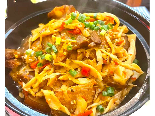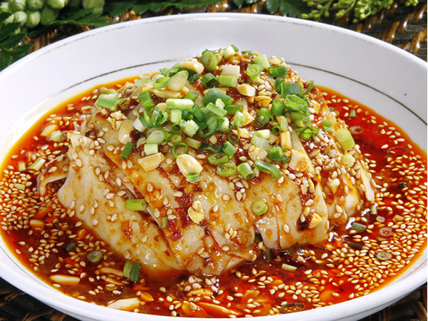 台湾夜市を代表する人気料理。日本の素麺に似た台湾独自の紅麺線を使用し、かつお出汁のスープで丁寧に煮込み、ホルモンやアサリをトッピングしています。
