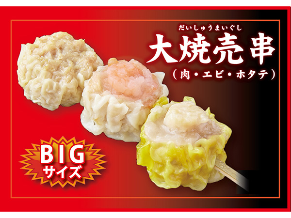 ボリュームたっぷり大焼売。肉大焼売、海老大焼売、ホタテ大焼売を1個ずつ串に刺した大人気満足串。