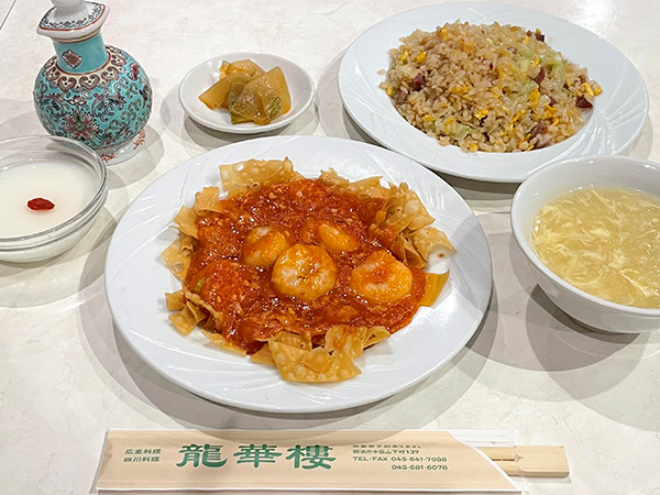 ぷりぷりのエビチリをトマトソースたっぷりで楽しめる定食。パラパラチャーハンとセットで、満足感もたっぷり!