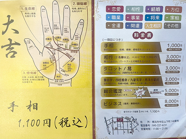 【手相(1,100円)、タロットカード・九星気学・算命学・生年月日(各3,300円)、数理運命学(4,400円)】