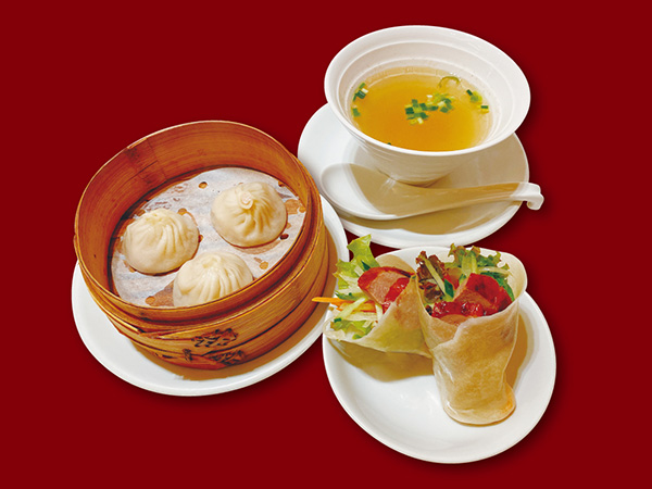 当店自慢の元祖窯焼き北京ダック巻と毎朝手作りしているスープたっぷり絶品小籠包に北京ダックでだしを取った澄んでいるのに深みがあるスープに海老入りワンタンが入ったスープ付きの満足セット。