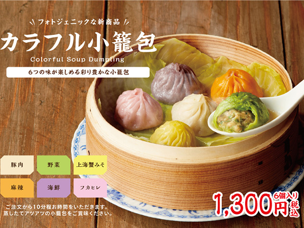 6つの味が楽しめる彩り豊かな小籠包。蒸したてアツアツをご賞味ください。