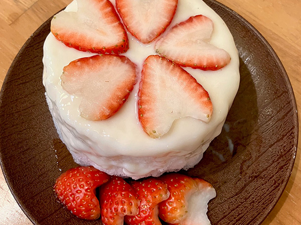 甘酸っぱいいちごとやさしい甘さの杏仁ソースがかかった、ふわふわのかき氷をお楽しみください。