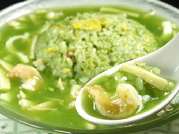 金華ハム、干し貝柱、海鮮、茸、新鮮な国産ほうれん草を使用したエメラルドグリーン色に輝く唯一無二の名物チャーハン