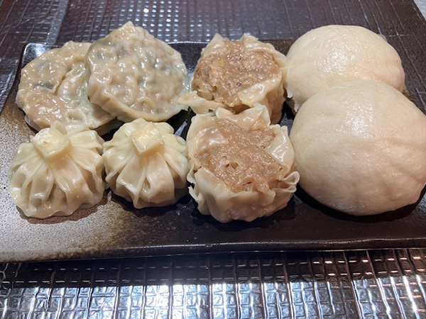 世界チャンピオンの肉まん2個、叉焼まん2個、ゴマ団子2個、海老ニラ焼まん1串(2個)、春巻2本