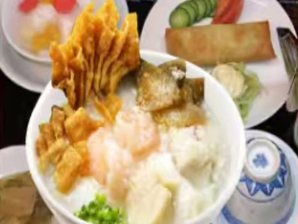 馬さんの店の人気NO.1の龍仙粥は、エビ・イカ・白身魚・貝柱・揚げワンタン入り。春巻・ミニサラダ・杏仁豆腐のついたお得なセットメニューです。