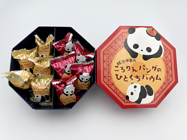 ころんとしたパンダのひとくちバウムクーヘンです。ホワイトチョコとスイートチョコの2種類の味がお楽しみいただけます。
