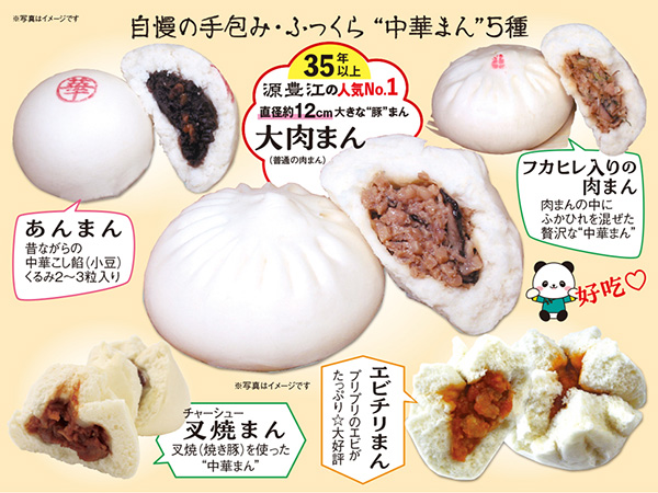 大肉まん、あんまん、フカヒレ入り肉まん、エビチリまん、叉焼まん(大)