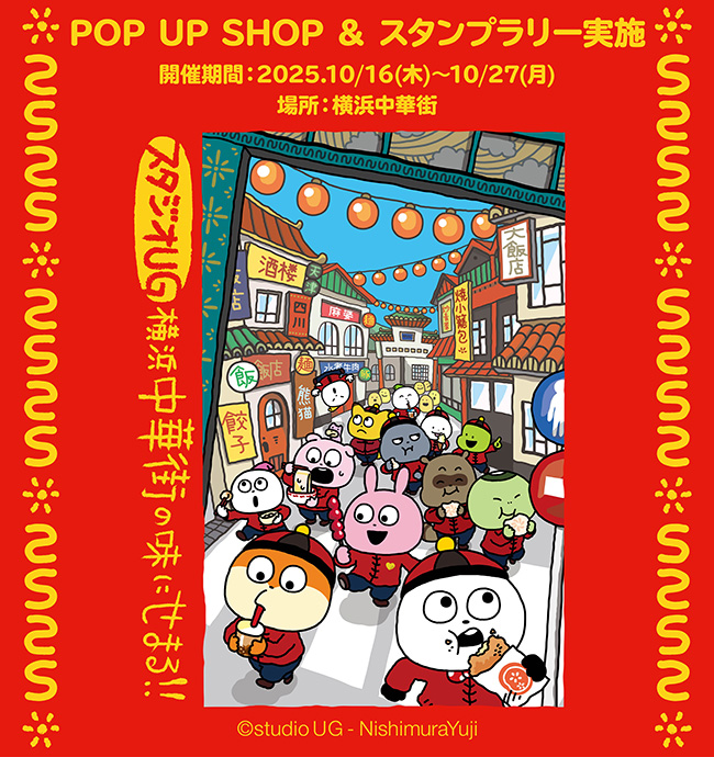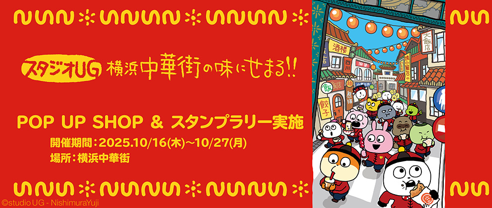 2025年10月16日(木)~10月27日(月)にて、『スタジオUG』横浜中華街の味にせまる!!コラボキャンペーン開催いたします。参加店舗で対象“中華まん”を注文していただきますと、特典ポストカードがゲットできます。また、ChinaTown80Hallには「POP UP SHOP」が登場します。イベント限定グッズが多数ラインナップ!今回の横浜中華街コラボに相応しいアイテムが目白押しです!