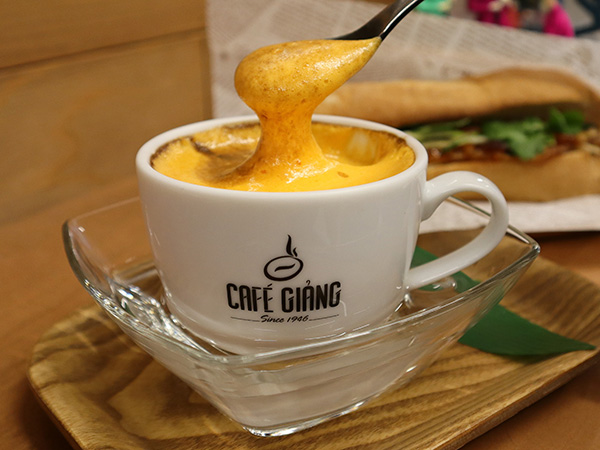 卵黄・砂糖を泡立てたクリームが、ベトナムコーヒーの上にたっぷり乗り、まるでカスタードやティラミスのような味わい。甘さと苦味のバランスが絶妙で、クセになる美味しさです。
