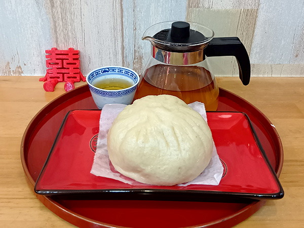 小麦の優しい風味が感じられるふわふわもっちり食感の皮に肉の旨味がぎっしりつまった食べ応えのある豚まんとおいしい中国茶(4、5杯)が飲めます。