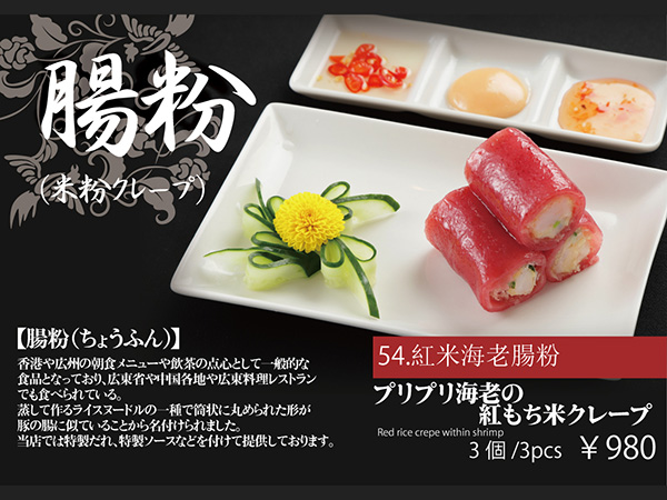鮮やかな紅色のもち米クレープでプリプリ海老をさくさく衣で包んで揚げた衣揚げを更に包んでいます。モチモチの皮とさくさくの衣、プリプリ海老餡が最高!当店でしか味わえない絶品料理。オリジナルソース(唐辛子ソース、スイートチリソース、特製マヨネーズソース)をつけてお召し上がりください。