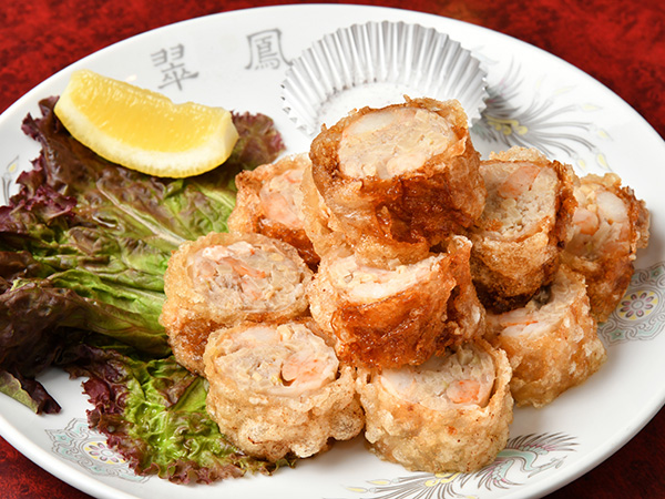 プリップリッなエビと筍を蝦餡にし、”威化紙(中国オブラート)”で包みパン粉をまぶして揚げております。外はサクッと、中はジューシーなやみつきなる当店自慢の一品です。