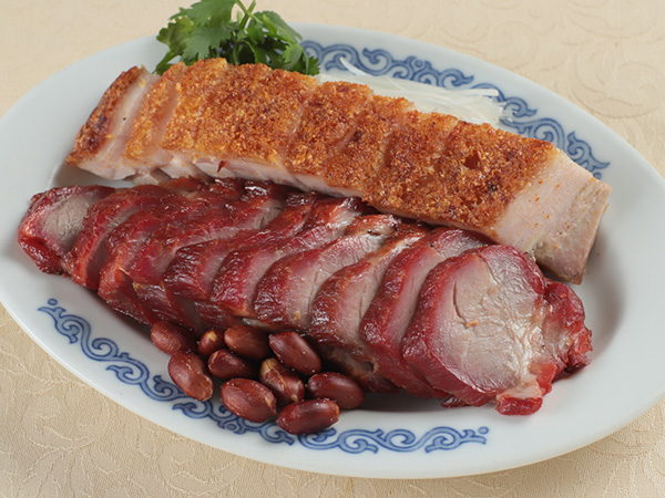 同發本館名物のチャーシューと、カリッとした皮にジューシーなバラ肉のバランスが絶妙な皮付き豚バラ肉の焼物。人気の2品を1皿で味わえます。