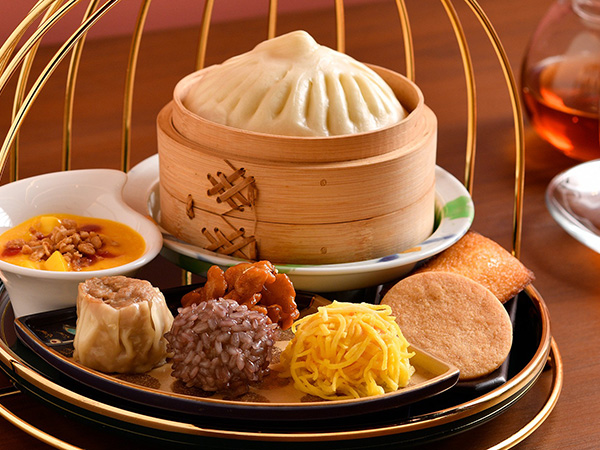 2024美食節金賞を受賞した「上海式角煮入り北島豚肉まん」と人気の点心、デザートの組み合わせです。