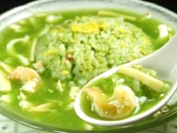 添加物不使用。金華ハム、干貝柱、海鮮、茸など、新鮮な国産ほうれん草を使用したエメラルドグリーン色に輝く世界に唯一無二の翡翠チャーハン。
