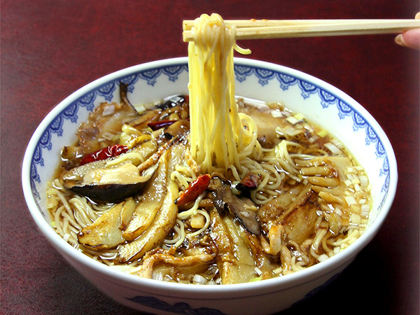 北京飯店オリジナル「ピリ辛茄子そば」。もともとは人気の一品料理「ピリ辛なす炒め」を二代目店主がまかないとしてラーメンにのせて楽しんでいたという裏メニュー。香ばしく炒めた茄子の旨みが絶妙に麺と絡み合い、あまりの美味しさに定番化された一杯です。