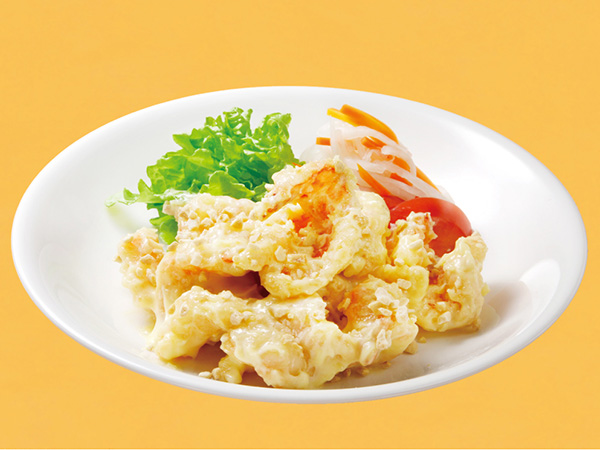 大ぶりでプリプリのブラックタイガーをカラッと揚げて、特製マヨネーズソースを絡めた当店自慢の逸品です。