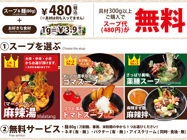 辛い中にも深みがあって飲み干せる1杯。スープは16種類以上の香辛料を独自で煮込んたオリジナル自家製スープ。選べる具材は約70種類。しかも具材300g以上でスープ+麺(480円)無料に!スープは【麻辣湯(大辛・中辛・小辛)】【ゴマ】【薬膳湯】【トマト】からお好みで選べます。自分だけのオリジナル麻辣湯をぜひ!