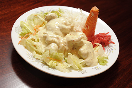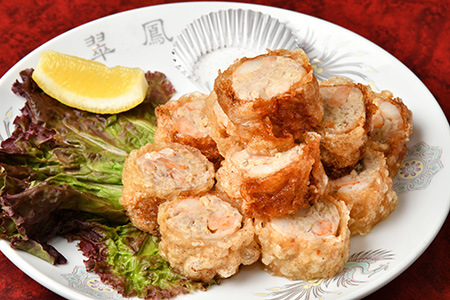 名物『海老と蟹の巻き揚げ』は、1キロ8800円のズワイガニや海老などが、たっぷり入った一品。10本お作りするのに3時間かかり、上記材料が10本に凝縮されています。3日前のご予約で『鯉の丸揚げ』もご予約可。【上海路】